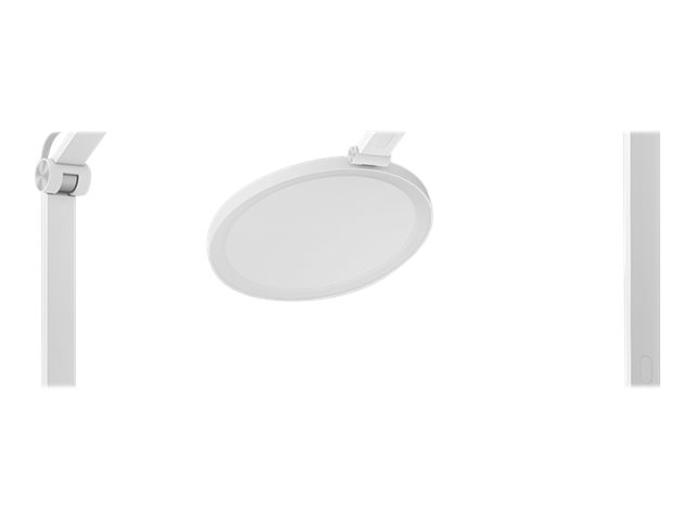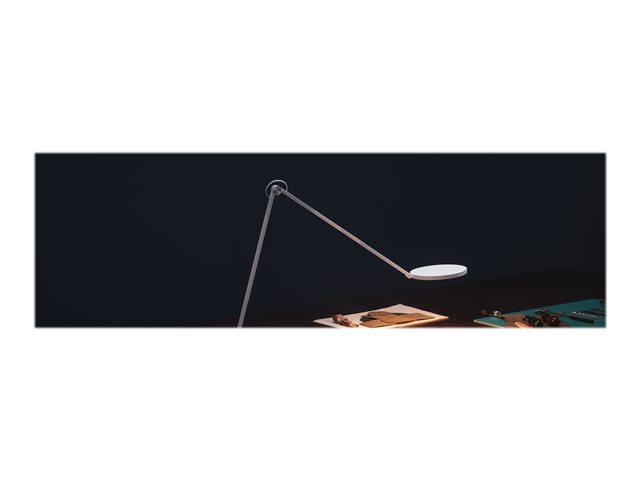 Construcción robusta con brazo sellado y acabado en blanco minimalista. Dimensiones optimizadas para cualquier escritorio (410 mm de altura), combinando estética y funcionalidad.