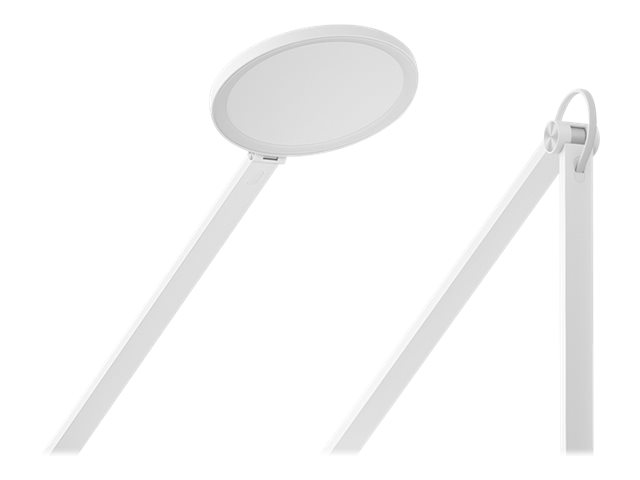 Construcción robusta con brazo sellado y acabado en blanco minimalista. Dimensiones optimizadas para cualquier escritorio (410 mm de altura), combinando estética y funcionalidad.